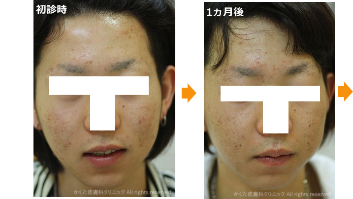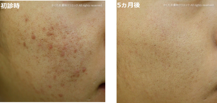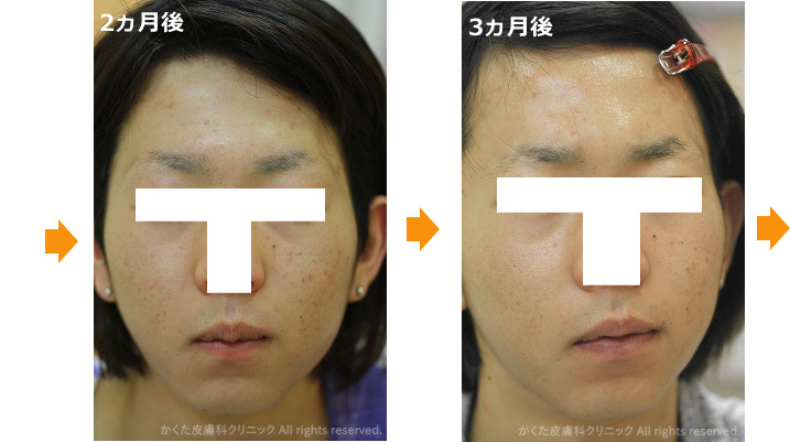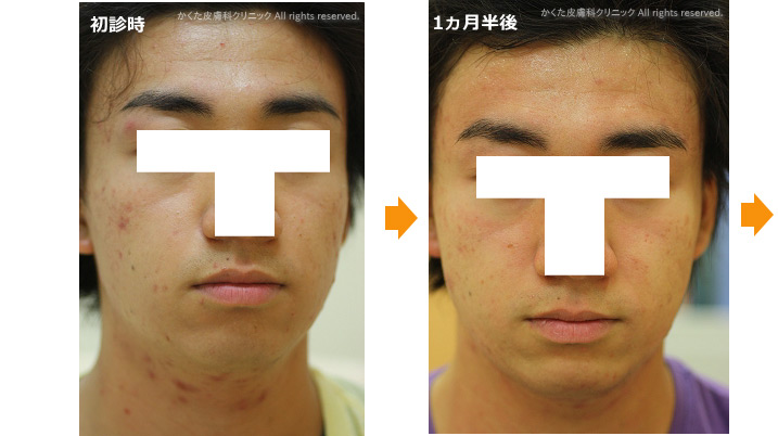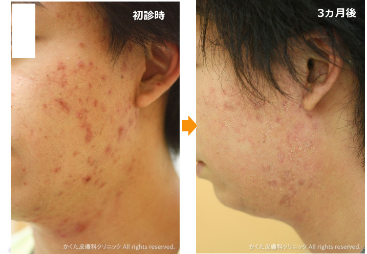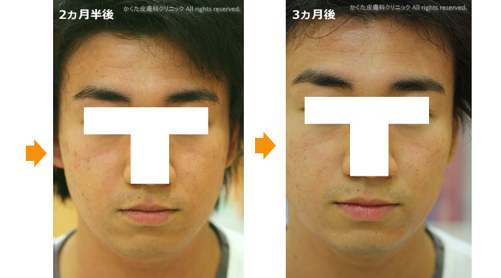 初診時にはお顔全体に大小のニキビがありました。治療の経過とともにニキビの赤みや毛穴の黒ずみがなくなり、お顔の色が統一し、印象も初診時と較べてよりさらに清潔感が増して見えます。この患者さんは初診から3ヶ月でほぼ安定し、現在も継続してニキビのない状態を維持できています。