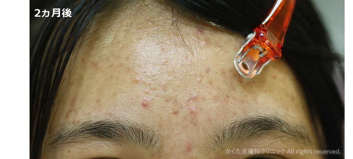治療開始2ヶ月、できていたニキビが治り、新生ニキビが減り、明らかにニキビの個数が減ったことが分かります。 |