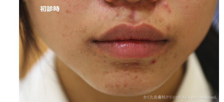 初診時の状態。口元のニキビは生理周期なども影響するため、治りづらいと されています。 |